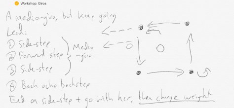 The theme was the back ocho, and the improver version ended in a new-to-me version of a Medio-giro, with a parada to complete the sequence …