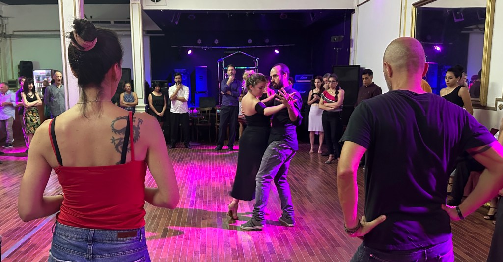 After that, I had mixed success with cabeceo – roughly 50% acceptances. I got chatting to a local leader who was having the same experience, and he explained that a lot of the people there didn’t dance tango, they just came to watch and hang out with their dancing friends.