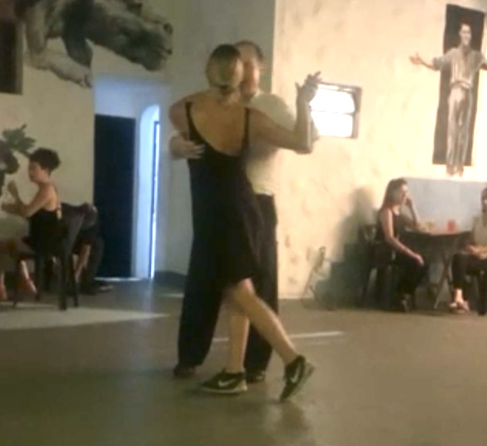 They weren’t tango dancers, and made the mistake of asking about it. Several days later, I’d finished my opening sentences on the topic. Later, in the dance room, Rach decided she wanted an immediate lesson! So we had one on the terrace, and she was an amazingly fast learner. We went from practice embrace changes of weight to close embrace ochos in about ten minutes! They later sent video of this – framegrab below.