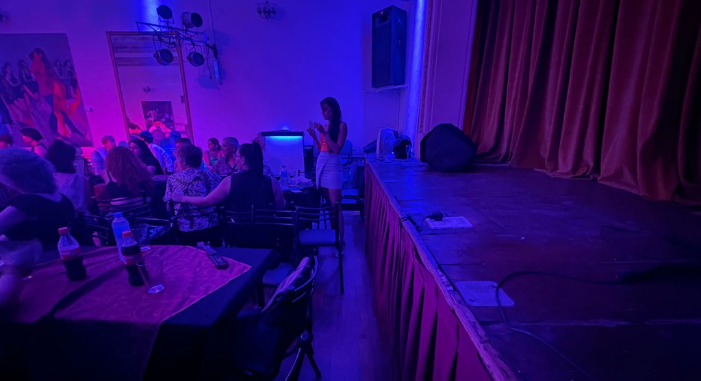 This is one of my favourite milongas, and with the D’Arienzo tribute band Los Heredores del Compas playing live, it was not to be missed! It ran from 9pm to 5am, and I reckoned the live set would probably start at around midnight to 00:30, so had booked a table for 11pm to be safe. They’d reserved my usual front-and-centre table for me.