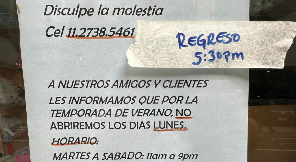 The hours of my local laundry are clearly shown as 11am to 9pm. Of course, this being Argentina, that doesn’t mean 11am to 9pm. It means ‘We do, broadly speaking, have the general ambition of operating hours which may perhaps bear some resemblance to these. Oh, and we may randomly close for half an hour to an hour at any point.’ Which explains this sign when I got there at 5pm …